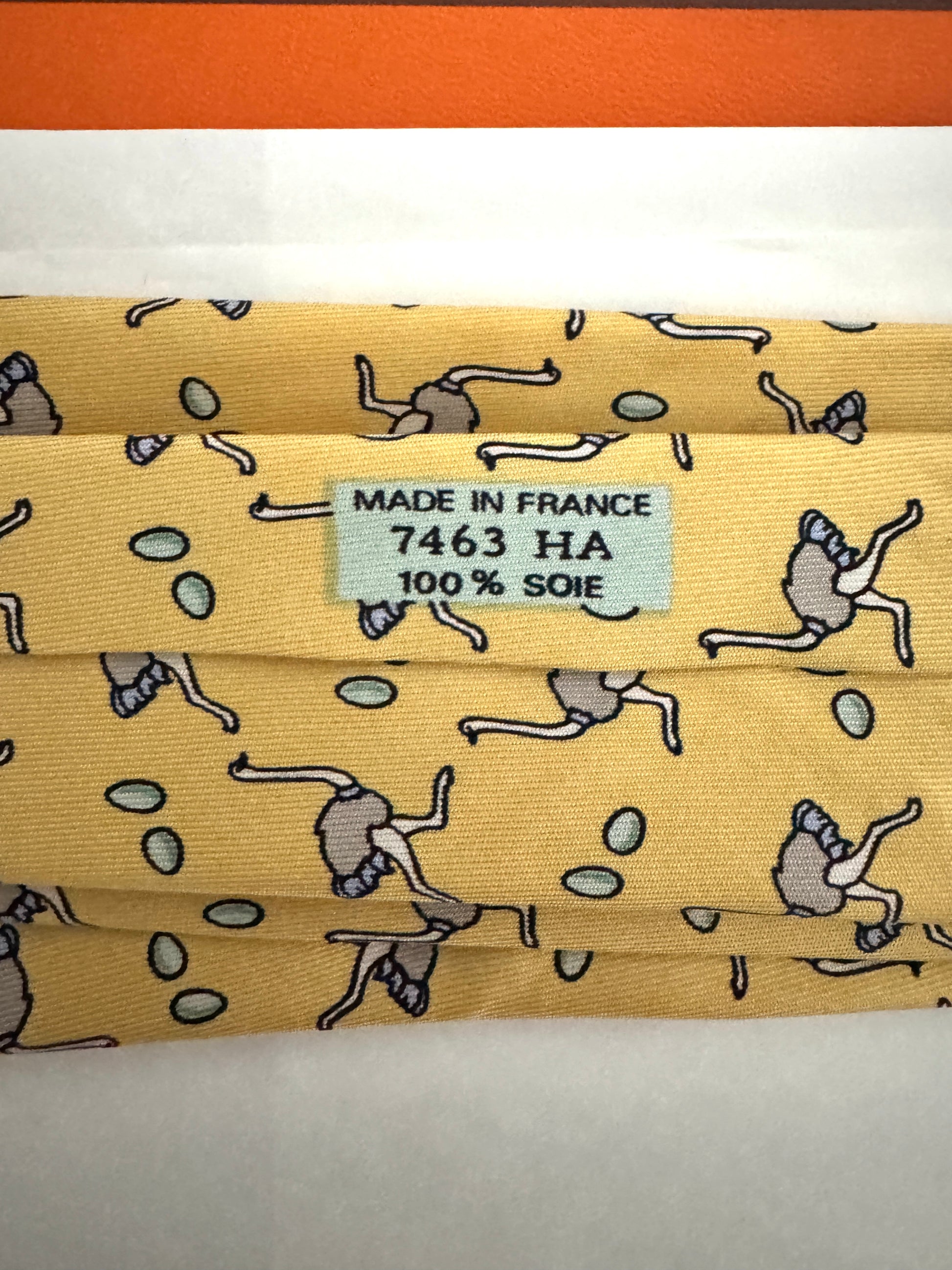 Cravate Hermès en soie Made in France – motif autruches & œufs sur fond jaune