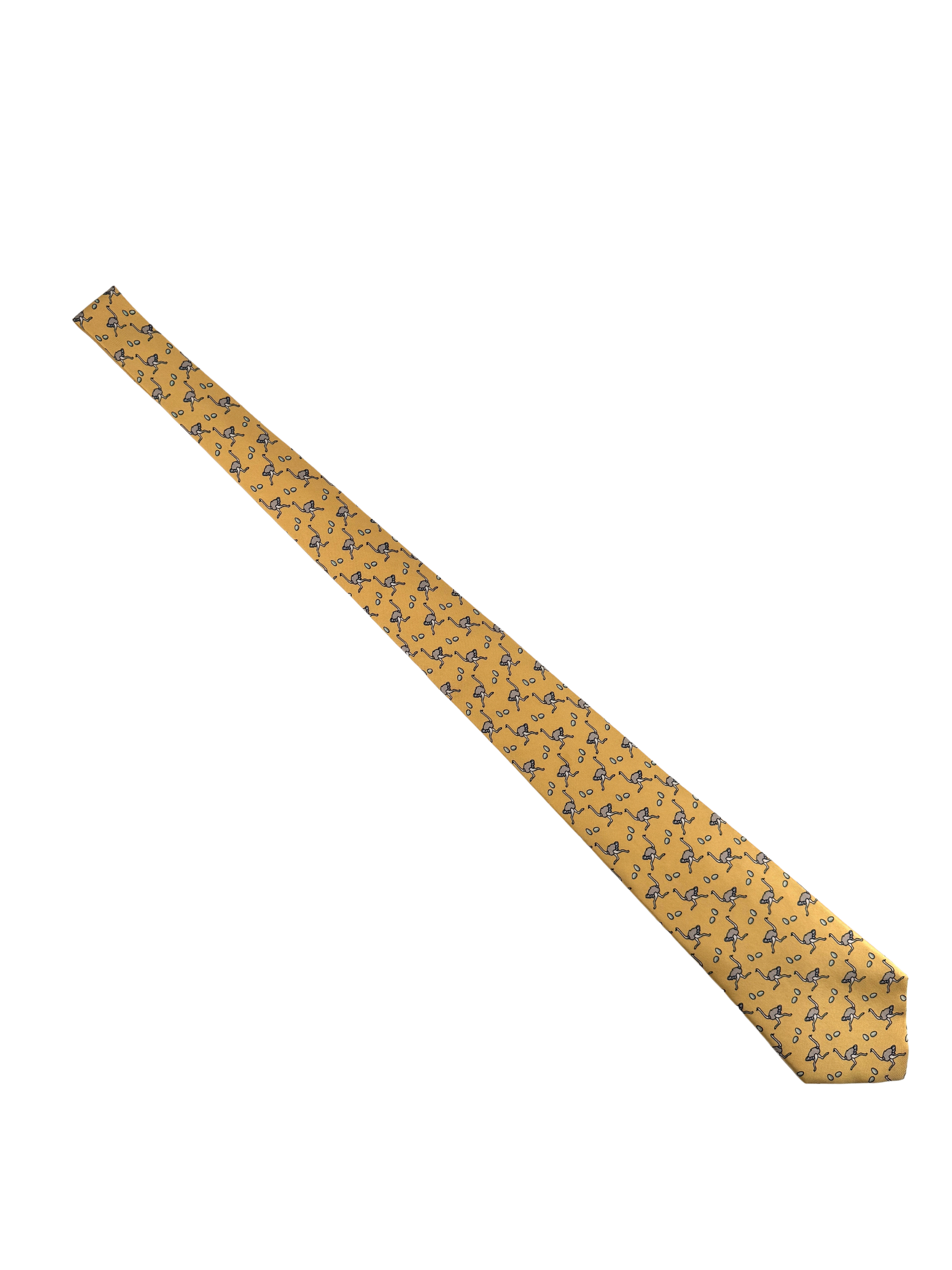 Avec son fond jaune chaud, presque “miel”, cette cravate Hermès installe d’emblée une élégance lumineuse, relevée d’un clin d’œil délicieusement rare : une pluie d’autruches stylisées accompagnées de petits œufs aux nuances vert d’eau. Le dessin est fin, parfaitement lisible, et suffisamment discret pour rester sophistiqué : un micro-motif qui se révèle au fil des mouvements, comme une signature réservée à ceux qui savent regarder.