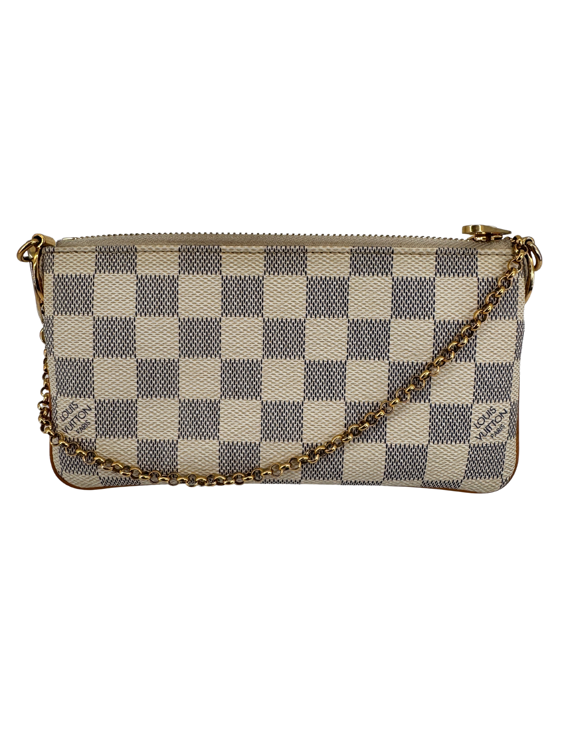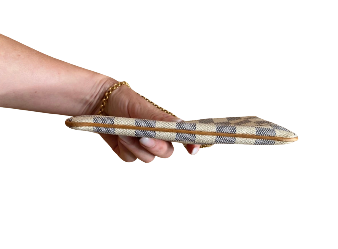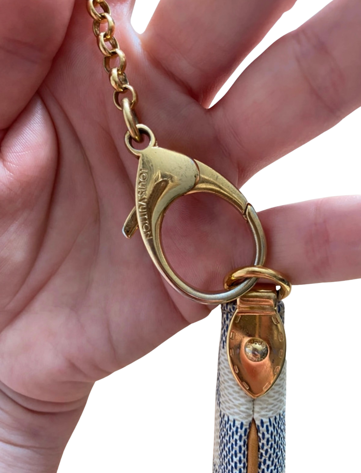 Its fine and structured silhouette, enhanced by the Damier Azur canvas, offers a graphic and summery interpretation of Louis Vuitton's iconic monogram. The subtle contrast between cream beige and light blue evokes the softness of Mediterranean travels, while the golden chain — both a piece of jewelry and a handle — gives the whole a precious and feminine dimension.