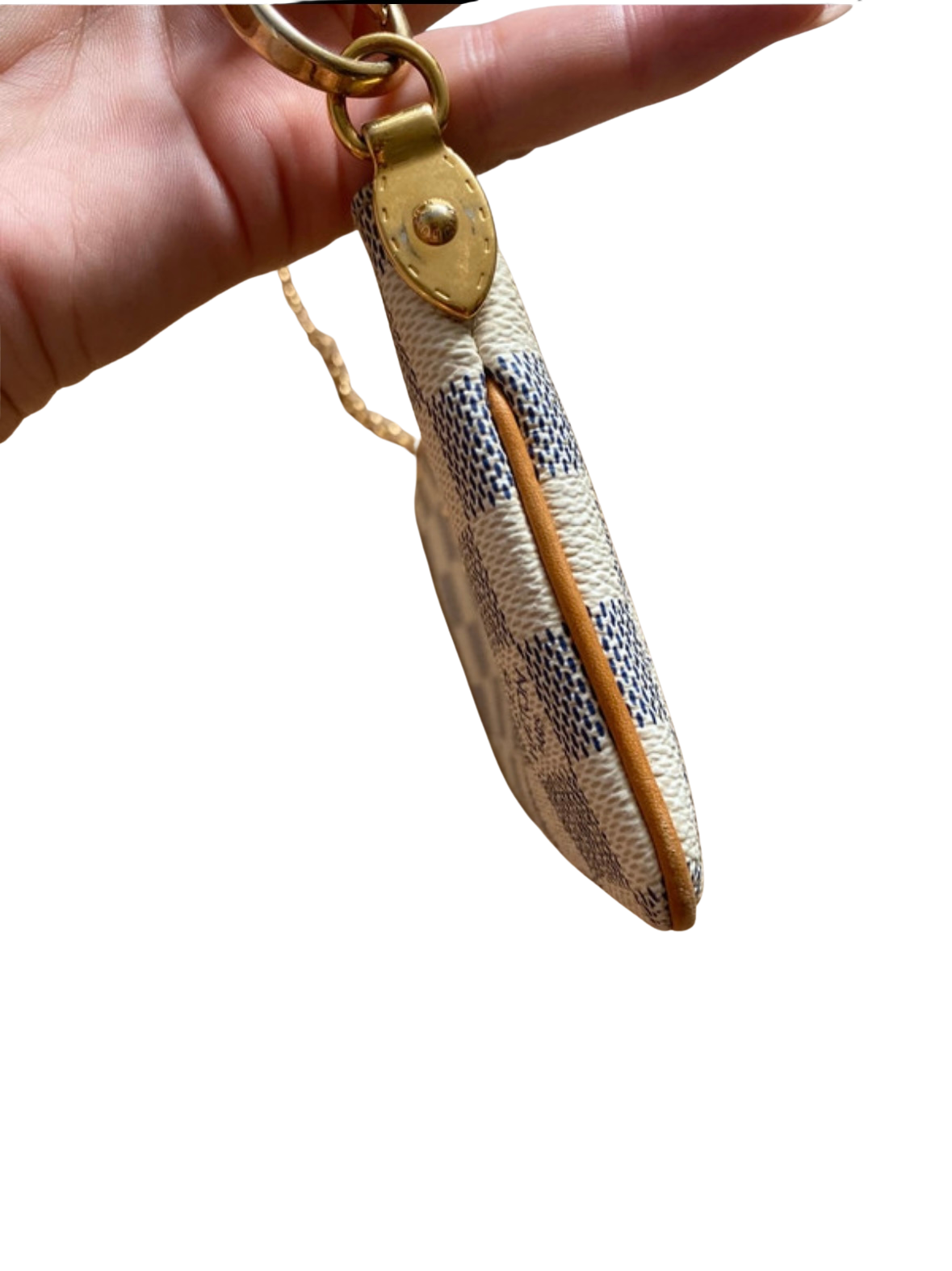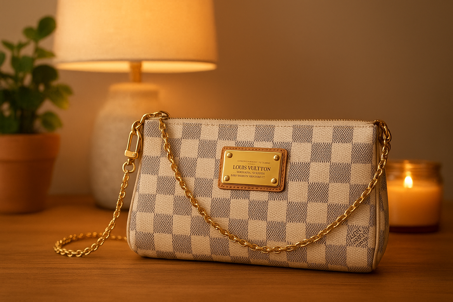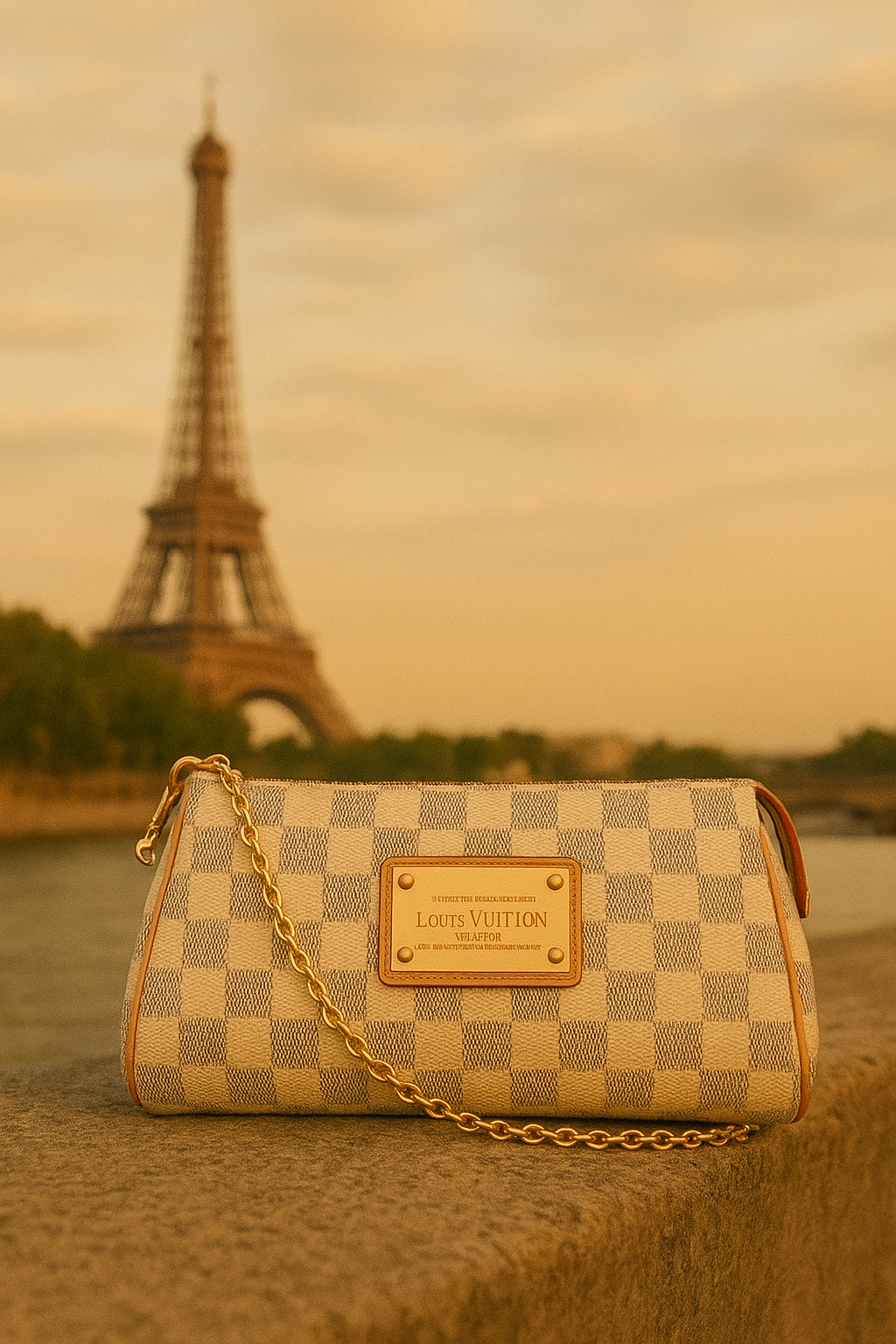Its fine and structured silhouette, enhanced by the Damier Azur canvas, offers a graphic and summery interpretation of Louis Vuitton's iconic monogram. The subtle contrast between cream beige and light blue evokes the softness of Mediterranean travels, while the golden chain — both a piece of jewelry and a handle — gives the whole a precious and feminine dimension.