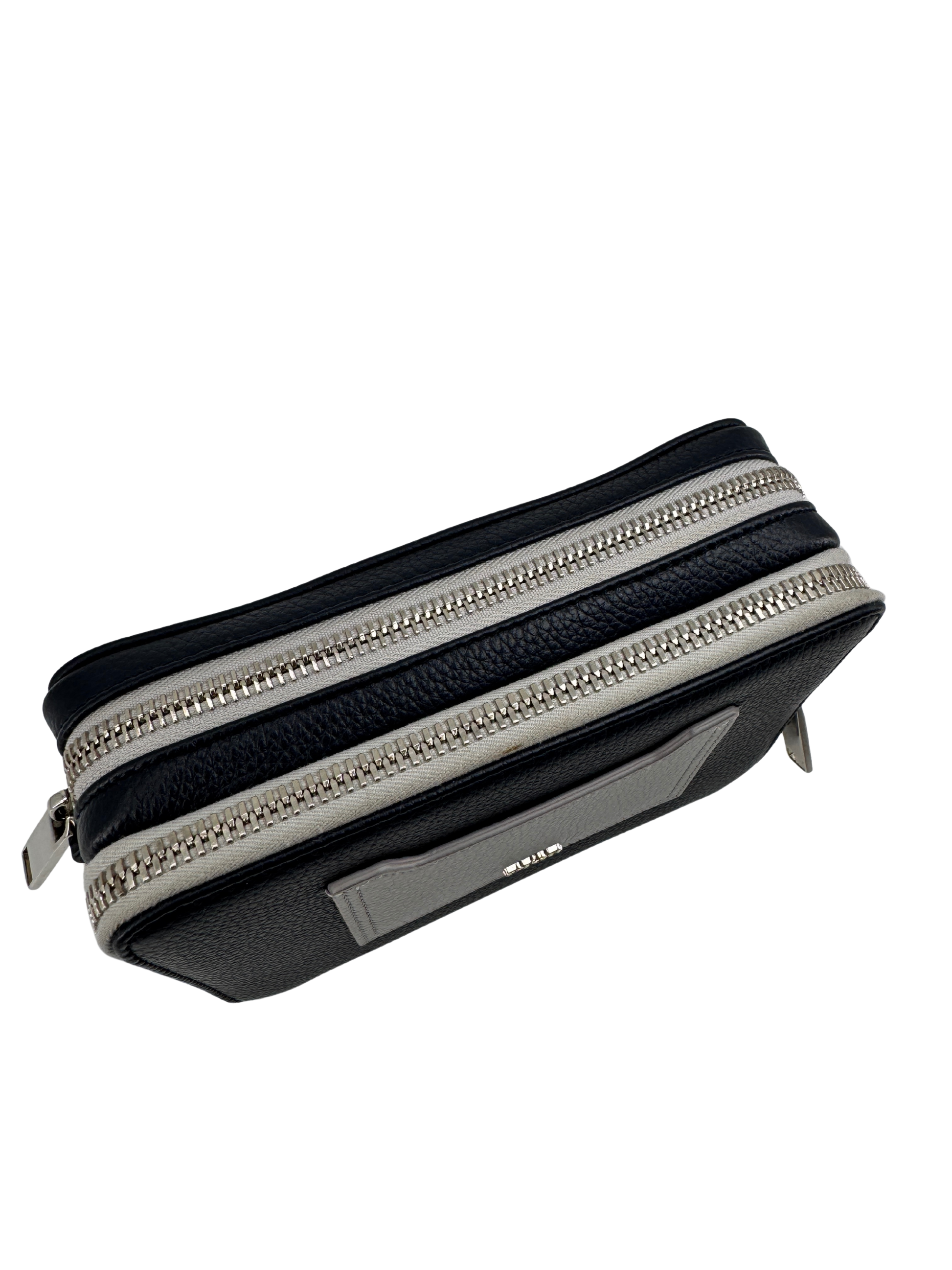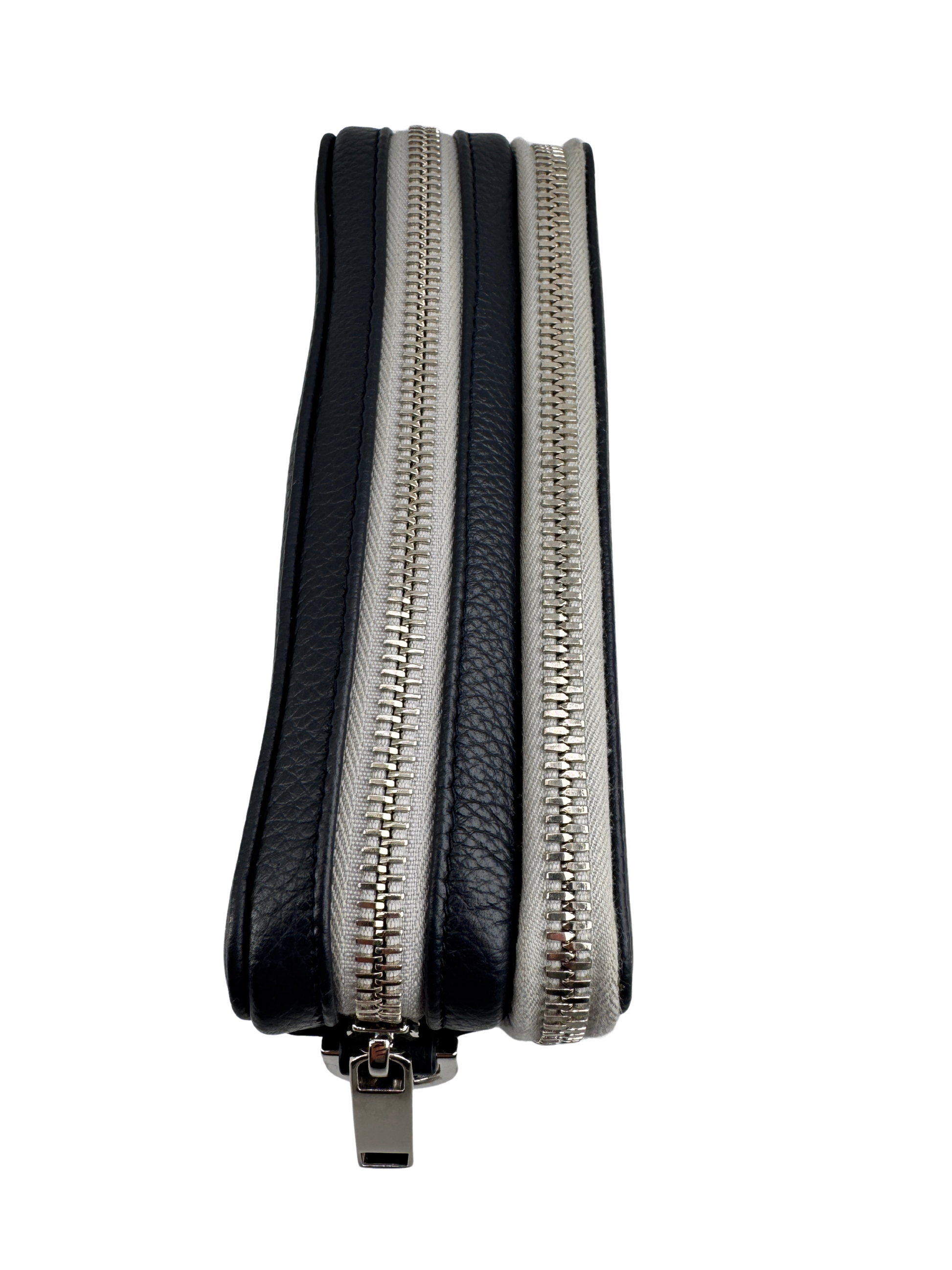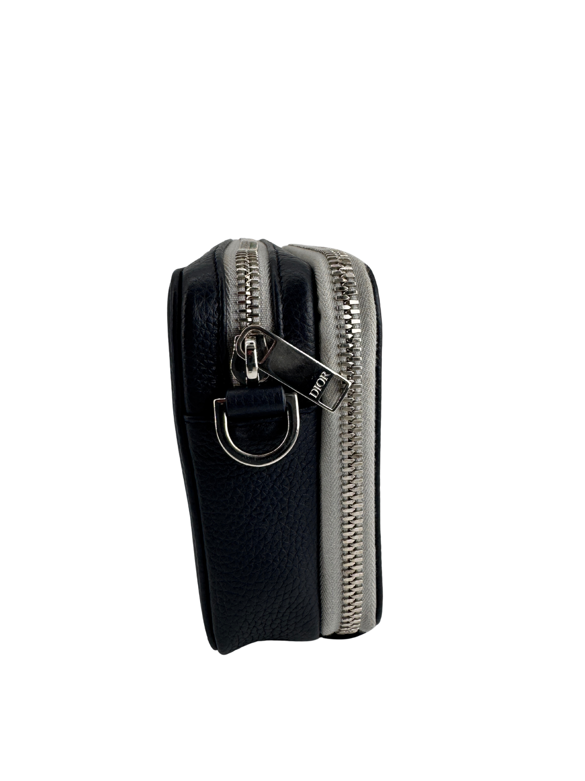 Subtle alliance between architectural rigor and the sensuality of leather, this Dior Navy/Gray shoulder bag embodies the exceptional craftsmanship of the House of Dior in a decidedly modern version. The streamlined silhouette, highlighted by finely grained leather, combines functionality and sophistication, while the refined contrast between deep navy blue and pearl gray gives it a graphic and timeless look.