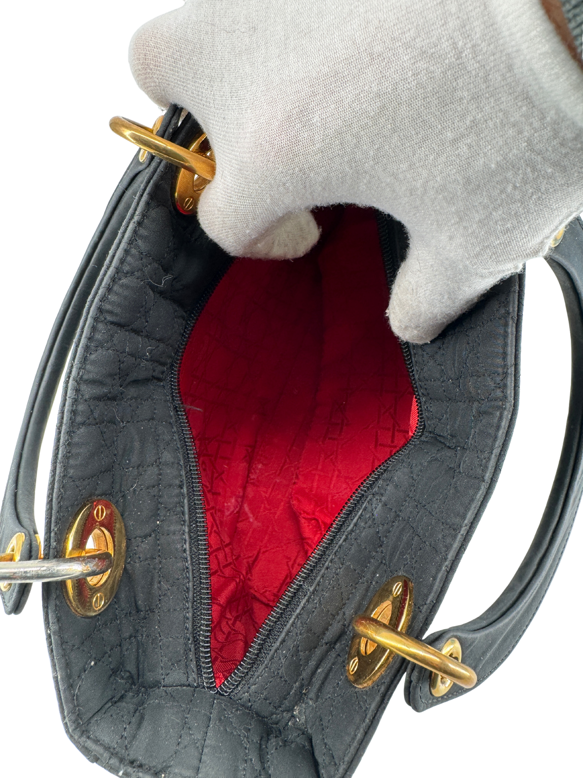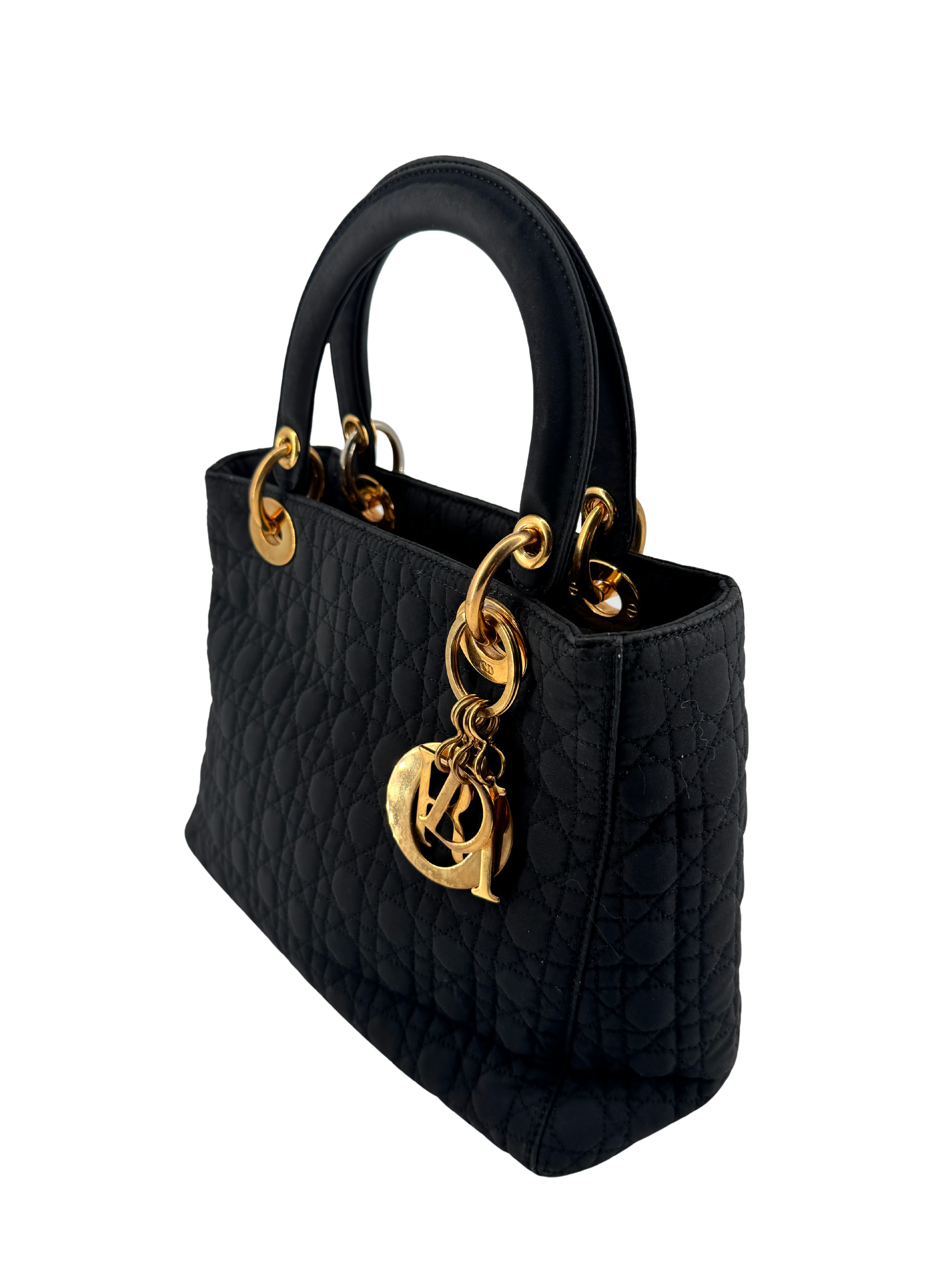 The design of this Lady Dior nylon bag is no accident: every element that composes it tells a story of precision, aesthetic intuition, and harmony of forms. The choice of woven nylon is not a modern concession, but a perfectly thought-out act of lightness. This material, both technical, durable, and refined, embodies a contemporary desire to lighten the silhouette without sacrificing elegance. It gives the cannage pattern an unprecedented depth, where shadow and light sculpt each relief like on a textile bas-relief.