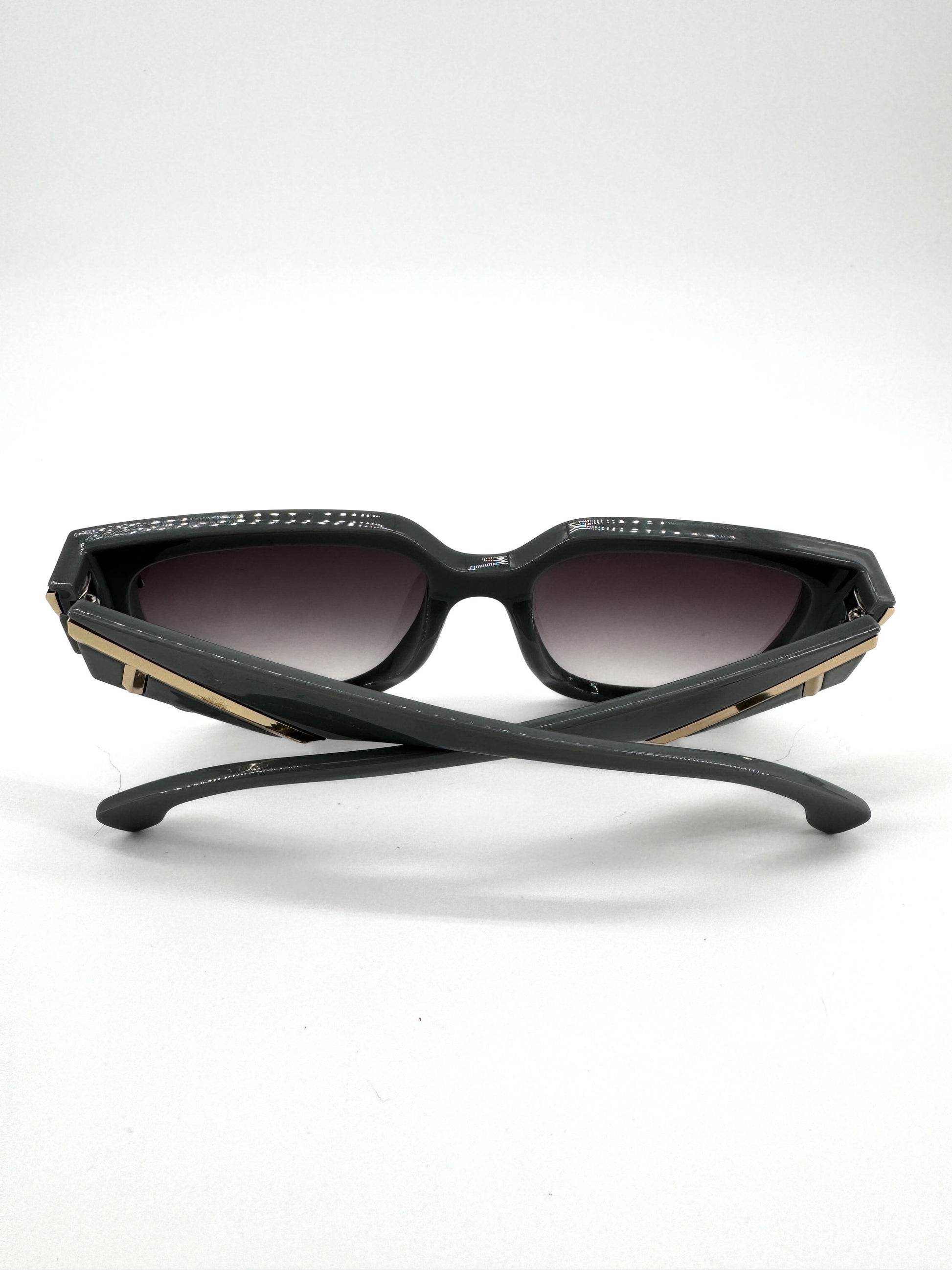 - Matériaux : monture en acétate noir brillant, ornements métalliques dorés