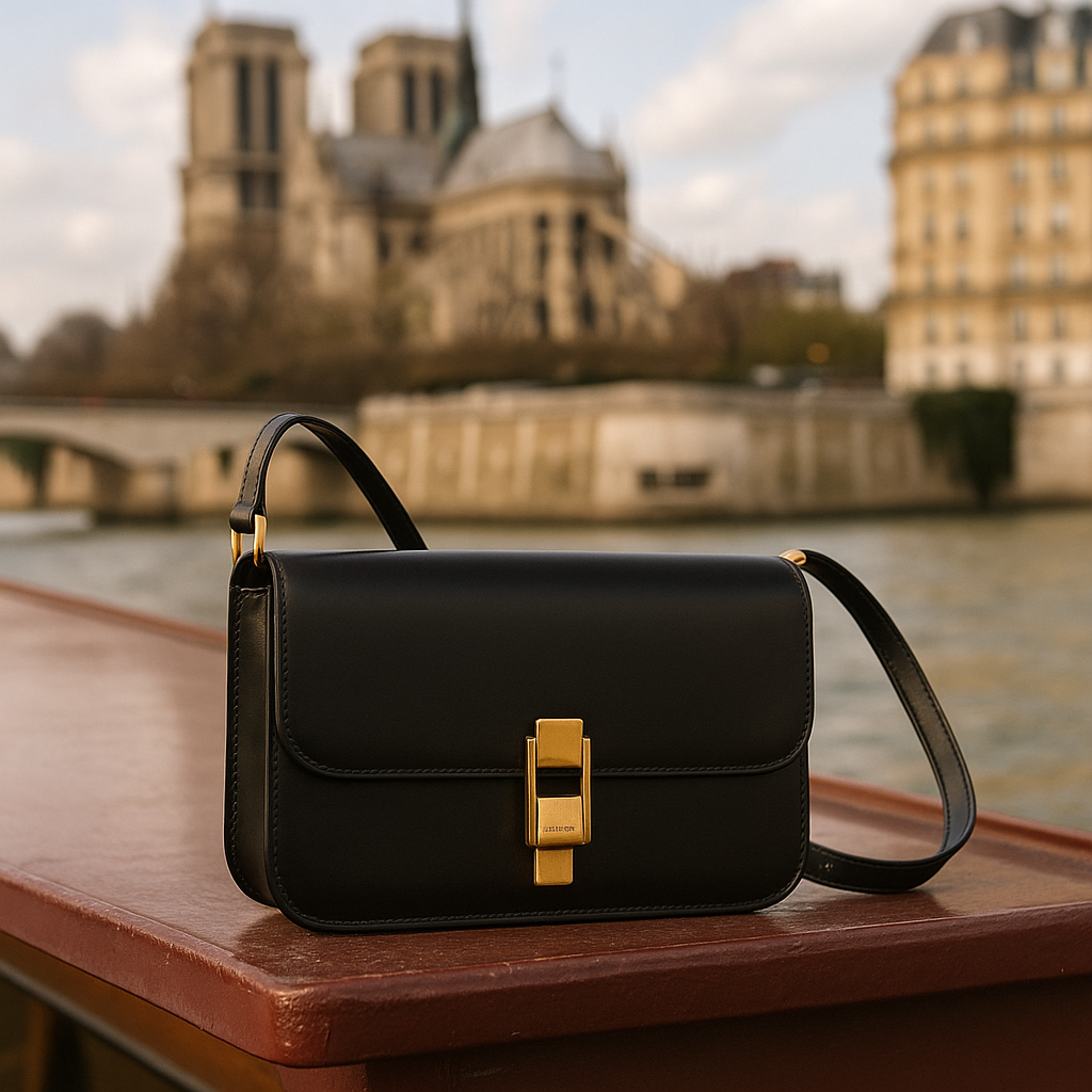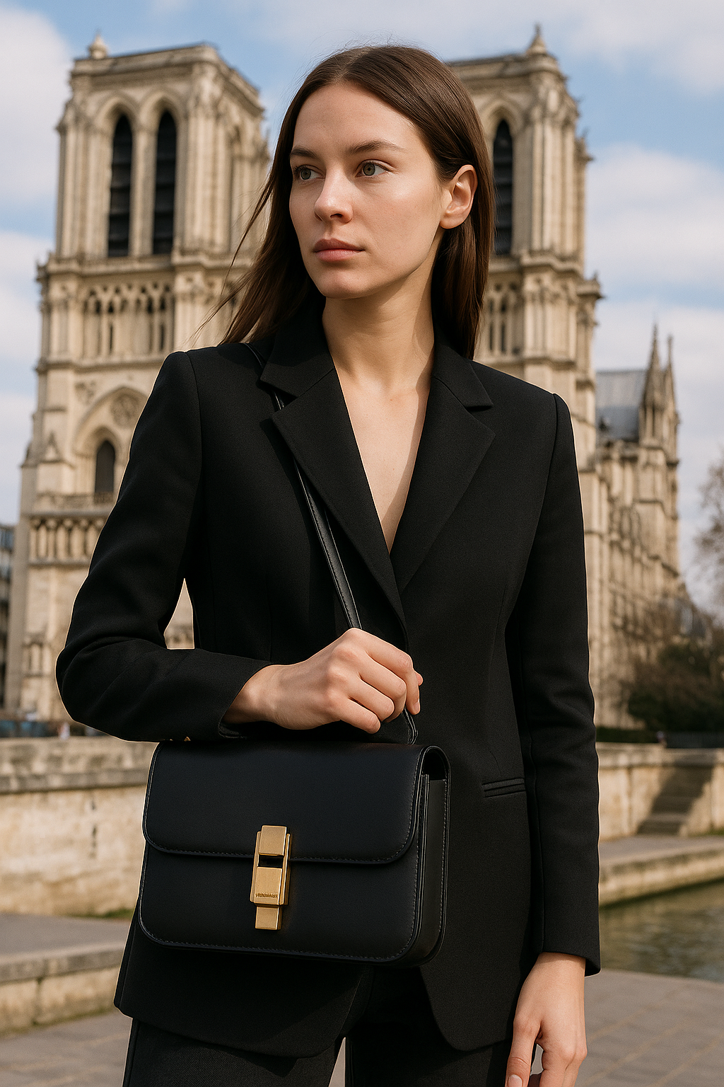 Conçu sous la direction artistique d’Anthony Vaccarello, le Carré Satchel incarne la quintessence de l’esprit Saint Laurent revisité : rigueur formelle, attrait fétichiste pour le noir, et culte du détail. Loin d’une simple pièce fonctionnelle, ce sac devient une déclaration esthétique. Le fermoir doré, inspiré des mécanismes industriels, évoque à la fois la précision d’une serrure et l’éclat d’un bijou brutaliste.