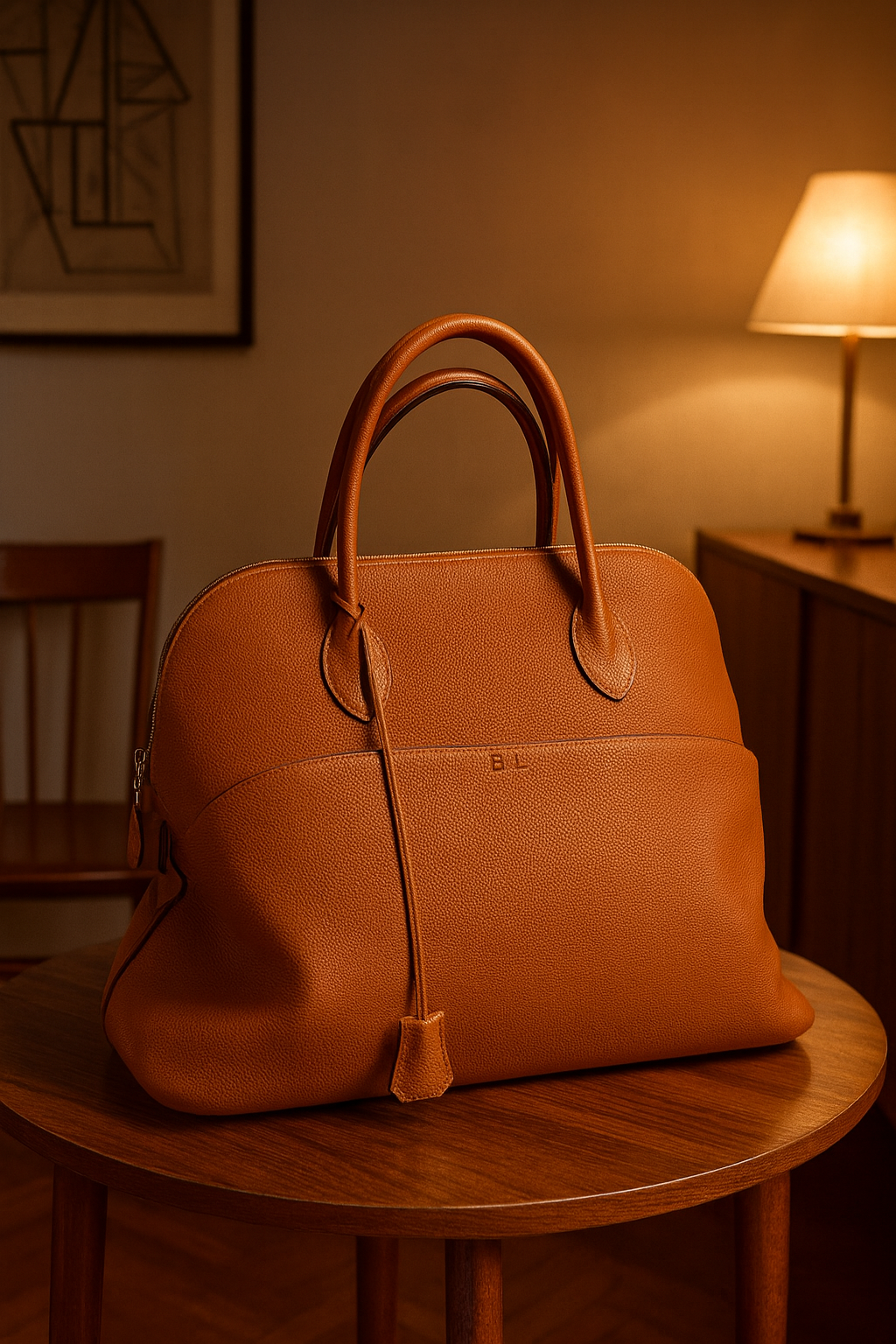 Le cuir de veau Togo, souple, résistant et délicatement grainé, se décline ici dans une tonalité « terre battue » pleine de caractère, rehaussée par des surpiqûres orange ton sur ton. Le sac est doté d’une fermeture zippée en métal palladié, d’une large poche extérieure discrètement marquée des initiales personnalisées « BL », et d’une clochette en cuir abritant son cadenas. À l’intérieur, la toile beige contraste élégamment avec le cuir, révélant une organisation soignée et fonctionnelle.
