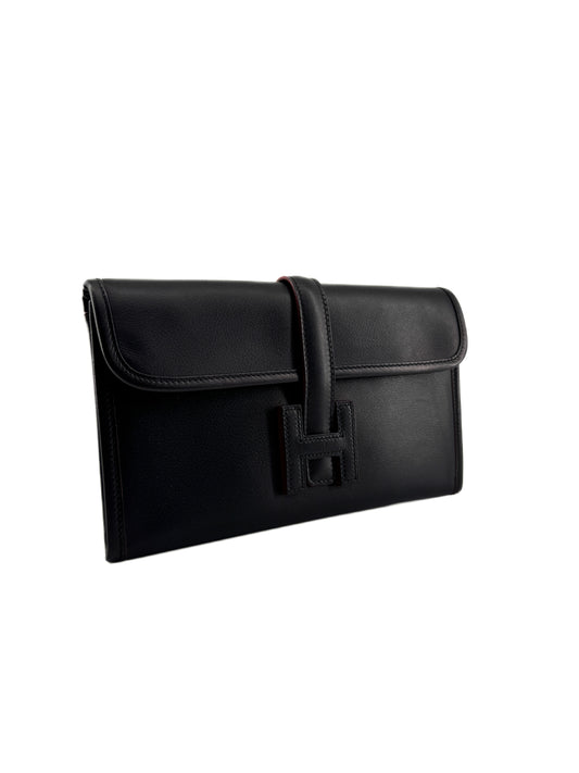 Pochette Hermès Jige en cuir de veau indigo – Finitions bordeaux